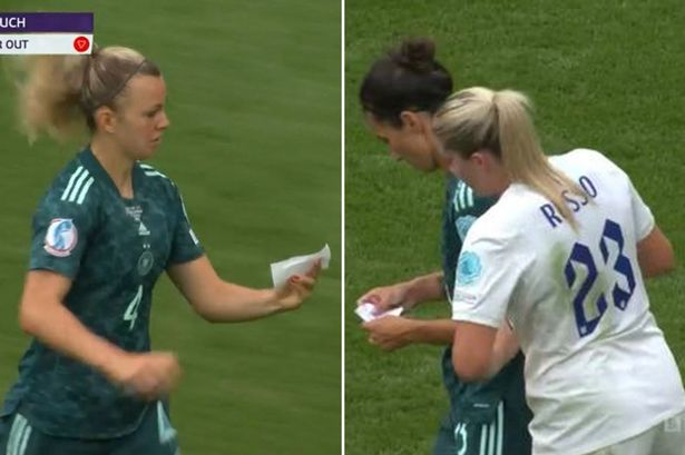 England forward Alessia Russo was spotted sneaking a peek at Germany’s tactics note as the Lionesses won Euro 2022 thanks to an extra-time victory at a packed Wembley