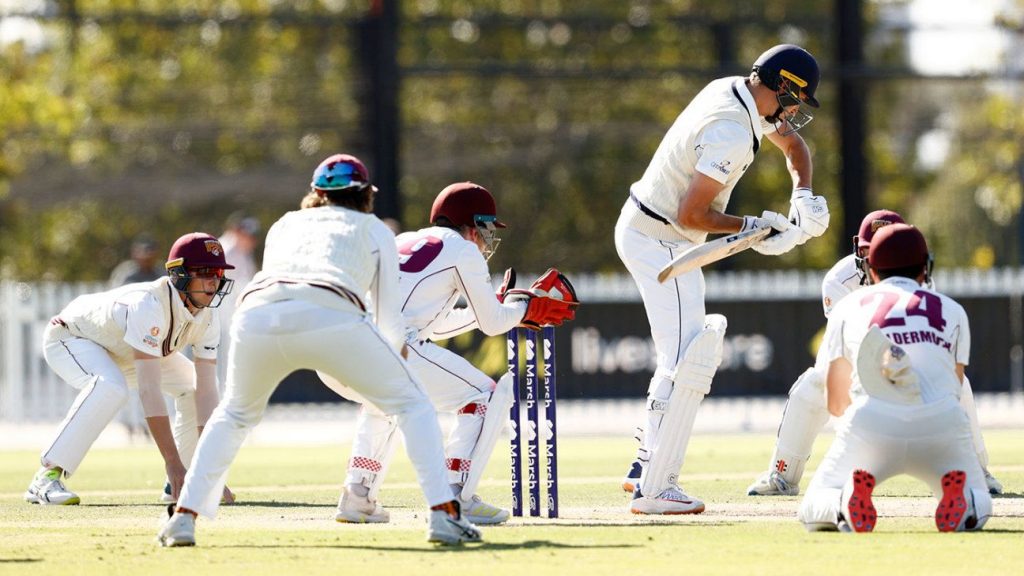 Queensland crowded the bat – in the final hour everyone was in a catching position – with Mitchell Swepson, Matt Kuhnemann, Renshaw and Gurinder Sandhu, the latter bowling offspin rather than his usual seam up, rattling through the overs and they created a number of near-misses for the batters.