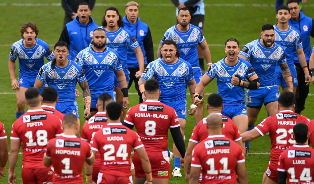With eyes bulging and nostrils flaring, Tonga and Samoa performed their pre-match war dances simultaneously in this Rugby League World Cup quarter-final, but stay tuned for the shock climax!
